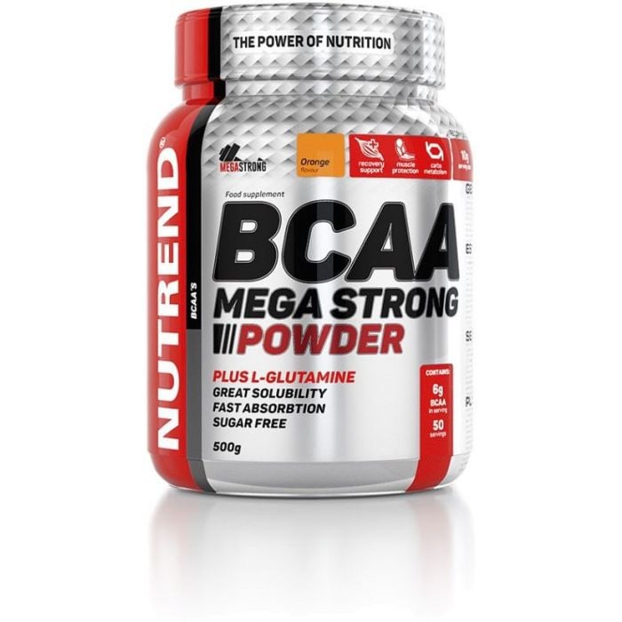 BCAA Mega Strong Powder са разтворими BCAA в съотношение за възстановяване 4:1:1, обогатени с L-глутамин. Една доза съдържа до 6 g BCAA, за да помогне в борбата с умората по време на тежки тренировки. Той също така подпомага регенерацията и растежа на мускулната маса след тренировка. Благодарение на много добрата разтворимост във вода, продуктът има много бързо усвояване в тялото.