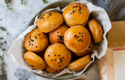 Първо пригответе тестото – смесете захарта с маята в топло (не горещо) мляко и оставете сместа да си почине за около 5 минути. През това време смесете брашното със солта, мащерката и настъргания пармезан в по-голяма купа. След това изсипете сместа за тестото, олиото, изварата в купата и омесете гладко тесто, което да не лепне. Покрийте го с чиста кърпа и го оставете да втаса в топло помещение за около 1 час. Когато тестото е втасало, разстелете го върху кухненския плот, който предварително сте покрили с брашно, така че да е приблизително 1.5 см дебело. Започнете да режете отделни кръгчета от тестото и ги слагайте в тава, покрита с хартия за печене. Оставете ги да втасат още малко поне за още 15 минути. Накрая, намажете ги с малко яйце, поръсете ги със сусам и с малко сол. Печете хлебчетата при температура от 180 °C, докато станат златисти или за около 10-15 минути в зависимост от размера им. Хлебчетата могат да се сервират веднага щом ги извадите от фурната. Насладете се на всяка хапка!