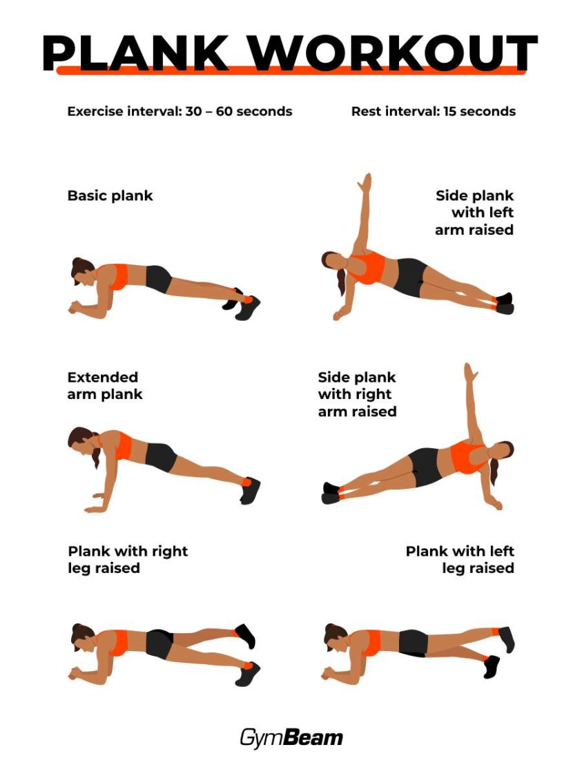 Можете да почерпите вдъхновение за обучение директно от нашия пример. В него има 4 вида планк, за да можете да насочите цялостно вниманието си към правите, дълбоките и косите коремни мускули. Ще редувате 30-60-секундни интервали за упражнения с 15-секундни интервали за почивка. Всичко това в 2-3 серии, между които включвате 60-90-секундна почивка.