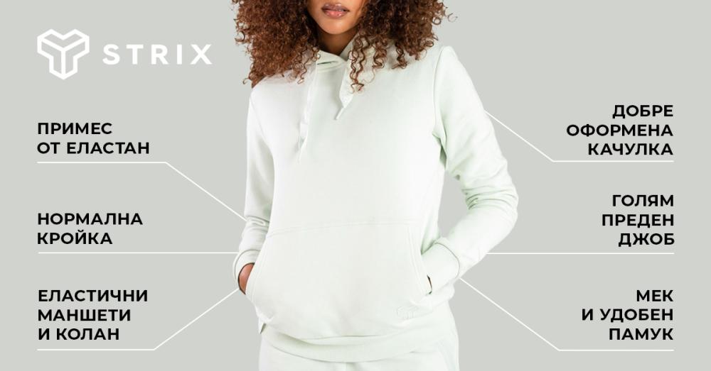 Дамският суичър Aster е удобен суичър за всички жени, които дават приоритет на комфорта, минималистичния дизайн и търсят само най-качественото облекло. Изработен е от висококачествен мек памук с примес на полиестер, което допринася за цялостния комфорт. Благодарение на качулката, този суичър ще ви сгрее, независимо дали тренирате или се изправяте пред студеното време. Покажете на всички, че работите усилено върху себе си и сте част от семейството на STRIX.