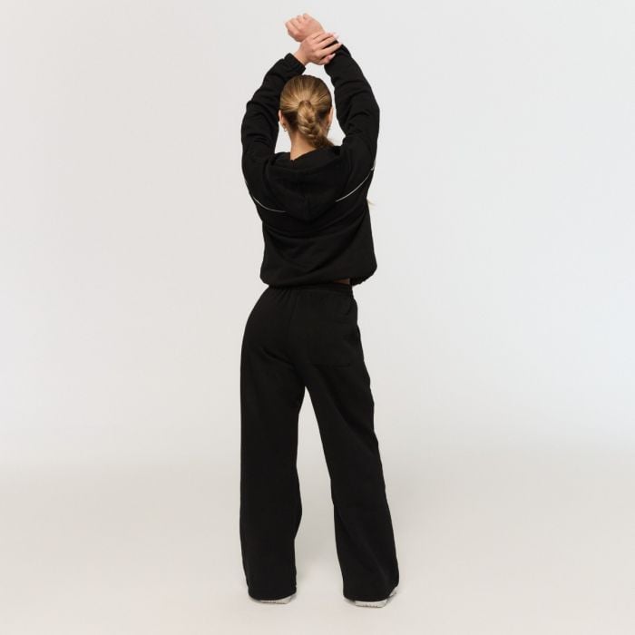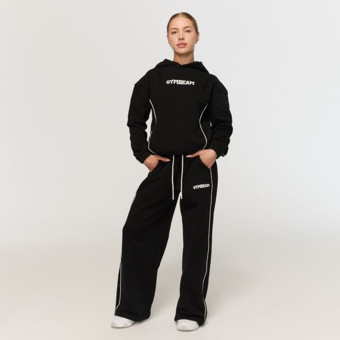 Това долнище се отличава с елегантна кройка с широки крачоли. Отстрани те са украсени с фини контрастни кантове, които оптически удължават краката и придават на долнището стилен ретро вид. Крачолите завършват с връзка с копче, което ви позволява да носите анцуга по два начина: или като свободни и широки панталони, или събрани при глезените, за да създадете изключително популярния ефект на "парашут".