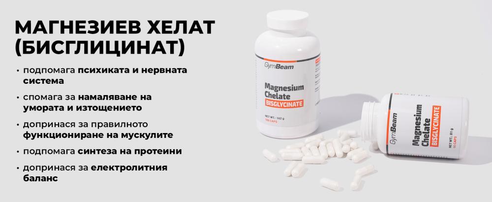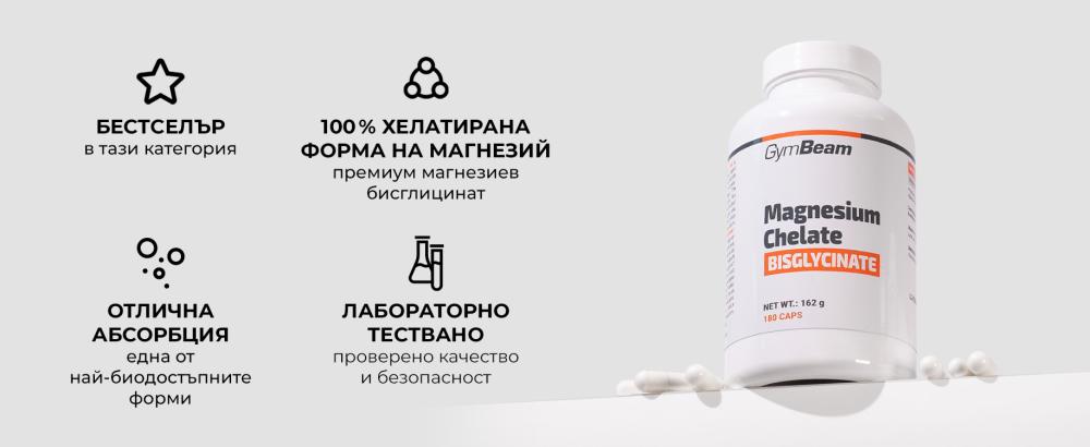 Магнезиевият хелат (бисглицинат) са капсули с магнезий в първокласна хелатна форма, която е сред най-добре усвоимите форми в организма. В една доза получавате 225 мг елементарен магнезий, който подпомага мускулната функция, нервната система, психичното здраве, а също така допринася за намаляване на умората и изтощението.