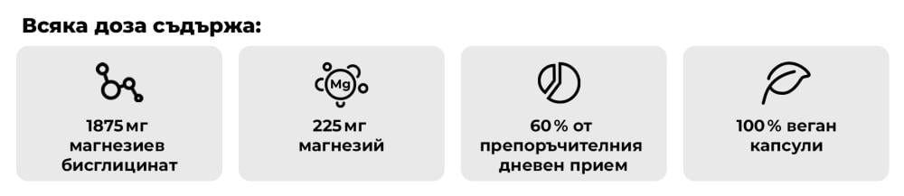 - 225 мг чист магнезий на доза (60% от препоръчителния дневен прием)