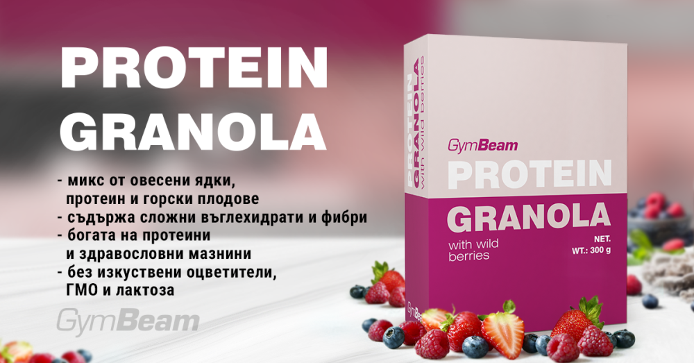Протеиновата гранола с горски плодове е смес от овесени ядки, соев протеинов концентрат, грахов изолат, внимателно подбрани горски плодове и други съставки. Заедно те създават вкусна гранола, която може да се ползва по всяко време на деня, макар че е особено идеална за закуска или лека закуска. Съдържа комплексни въглехидрати, както и висок дял протеини, които допринасят за растежа и поддържането на мускулите. Освен това има възхитителен вкус и е подходящо за вегани.