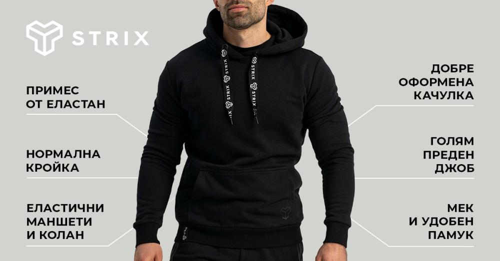 Суичърът Aster е изключително удобно облекло за всички мъже, които предпочитат комфорта, минималистичния дизайн и искат само най-доброто за себе си. Изработен е от висококачествен мек памук с примес на полиестер, което допринася за високия комфорт, който осигурява. Суичърът ще ви помогне да останете приятно загрети, независимо дали тренирате или сте изправени пред лошото време. Нека вашето обкръжение знае, че работите усилено върху себе си и сте част от семейството на STRIX.