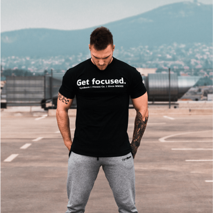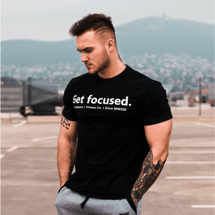 Тениската Get Focused в черен цвят с къс ръкав отива на всеки спортист, културист или състезател. Чудесно ще пасне на раменете и на ръцете ви, така че ще подчертае вашите напомпани мускули. Съсредоточете се върху напредъка с тази мотивираща тениска, която чудесно ще ви служи във фитнес залата, но и във всекидневието.
