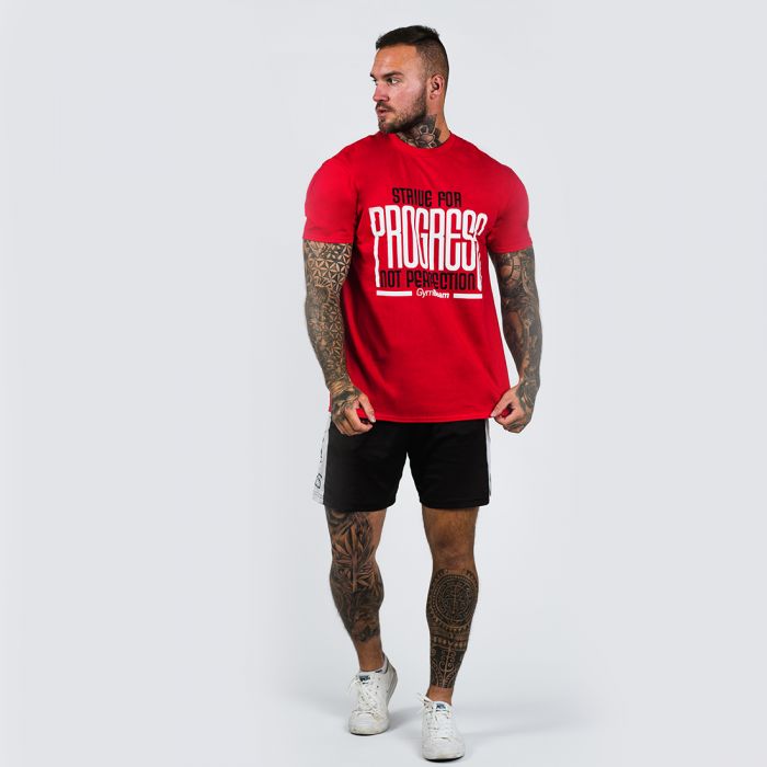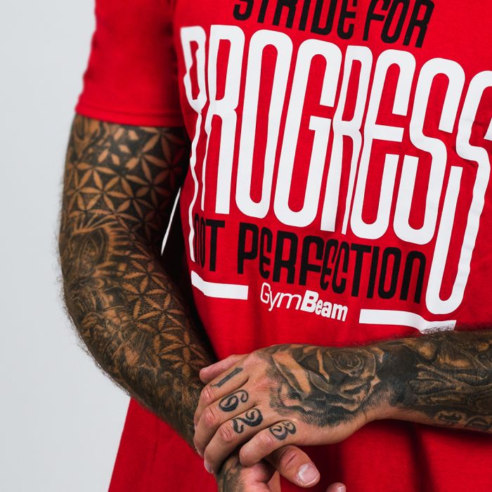 Тениската Progress Red не трябва да липсва в гардероба на никой спортист, който тренира за напредък, а не за съвършенство. Тениската има свободна кройка, модерен дизайн и голям надпис на гърдите "Strive for progress, not perfection". Тя е изработена от памук, затова ще я носите с удоволствие както за ежедневна употреба, така и по време на тренировки.