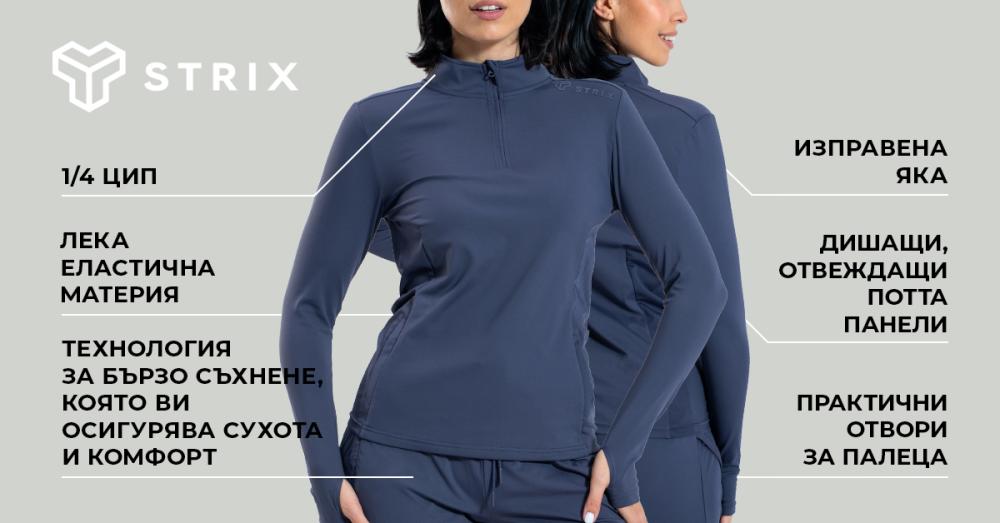 Дамският спортен топ ULTRA е функционална спортна дреха с дълъг ръкав, създадена за активен начин на живот. Тя принадлежи към премиум семейството на марката STRIX, което отговаря на изискванията дори на най-взискателните спортисти. Изработена е от комбинация от полиестер и еластан, което ѝ гарантира гъвкавост и издръжливост във всяко отношение. Тя отлично отвежда потта и благодарение на технологията за бързо съхнене ще ви държи сухи дори по време на интензивни тренировки. Освен това има и дишащи панели отстрани, които се грижат за функционалната проветривост.